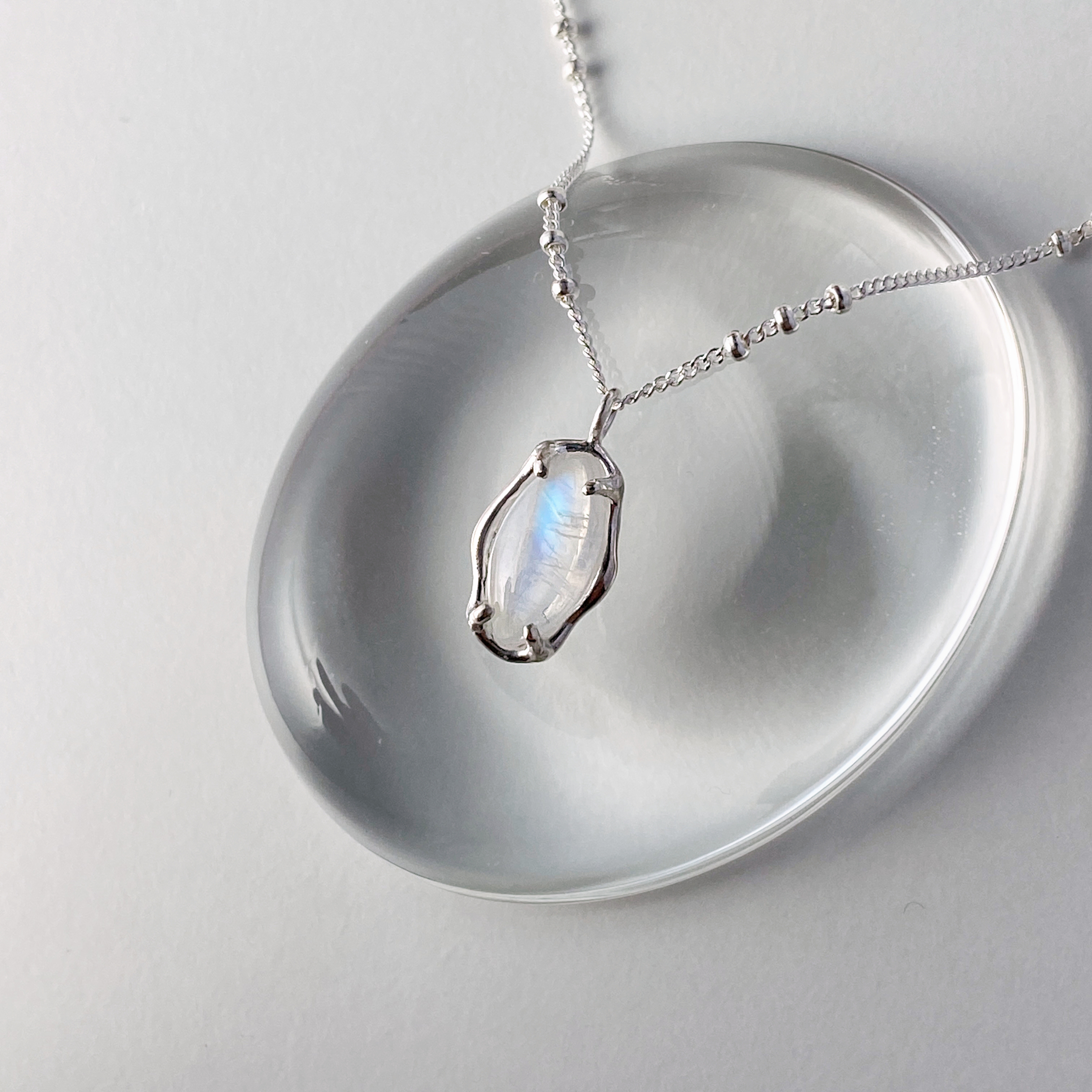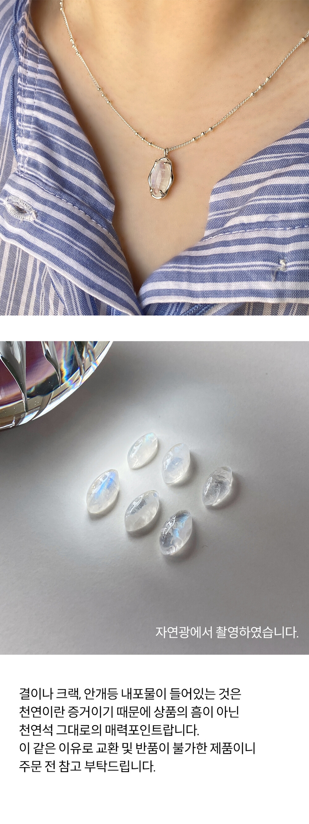 보트 형태의 마퀴즈 모양의 레인보 문스톤으로 자연스러운 내포물과 푸른 광학이 매력적입니다.