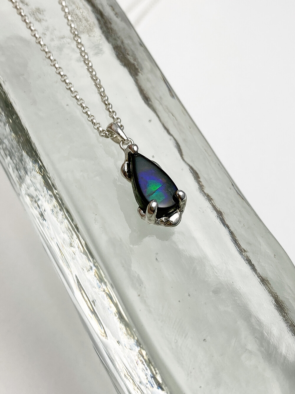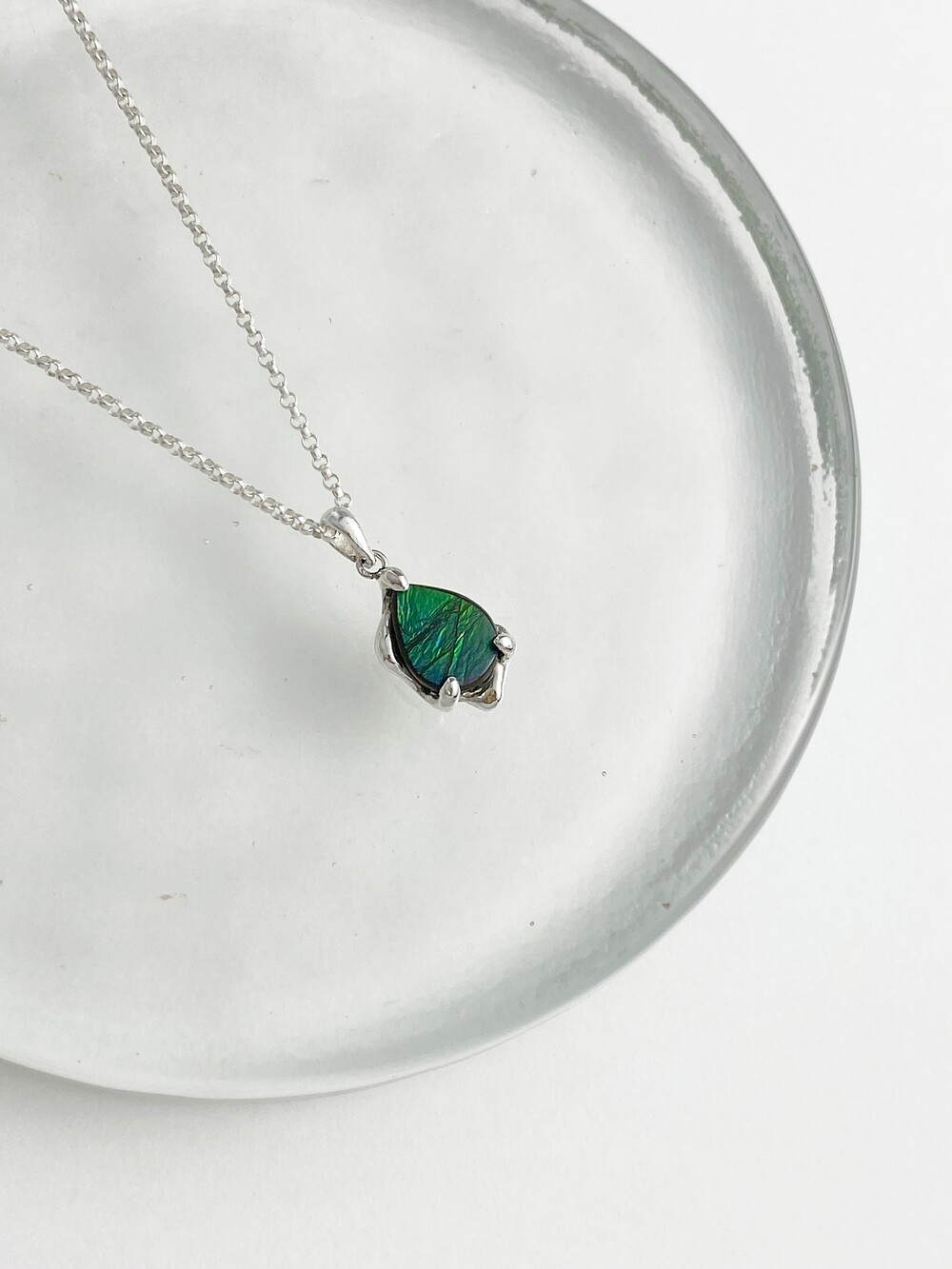 푸름과 초록의 컬러가 균형 있게 어우러져 오로라가 비춰진 느낌으로 도톰한 물방울 형태가 특징이며 광각과 시각에 따라 색이 미묘하게 변합니다.