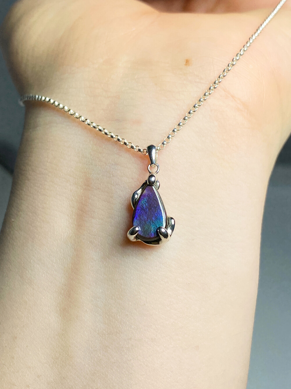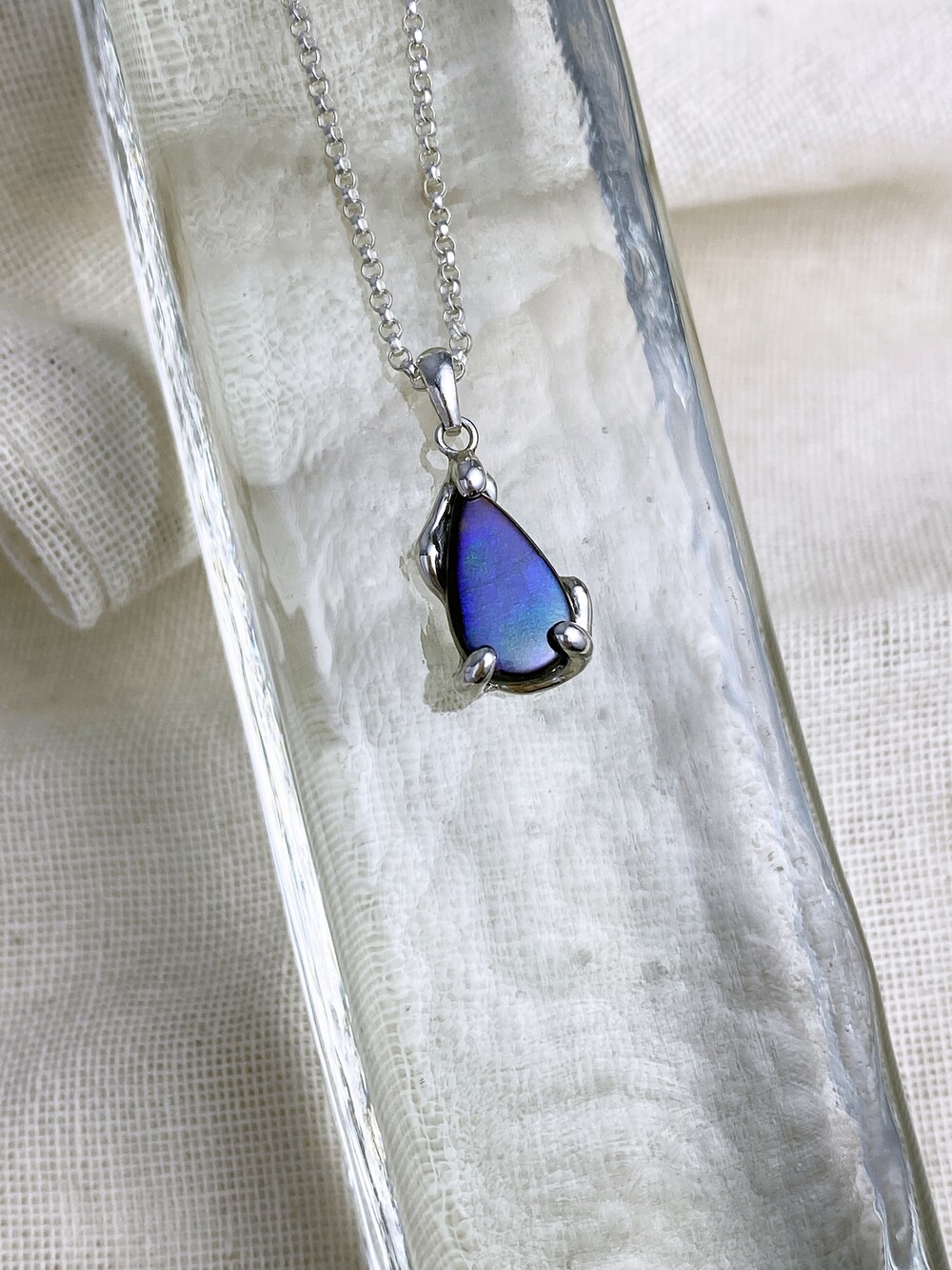딥한 보랏빛을 중심으로 푸름과 초록빛이 은은하게 담긴 물방울 형태로 빛의 각도에 따라 잔잔하고 깊이 있는 분위기가 매력입니다.